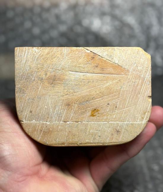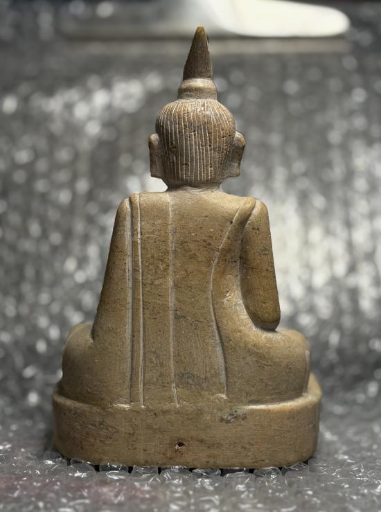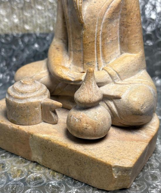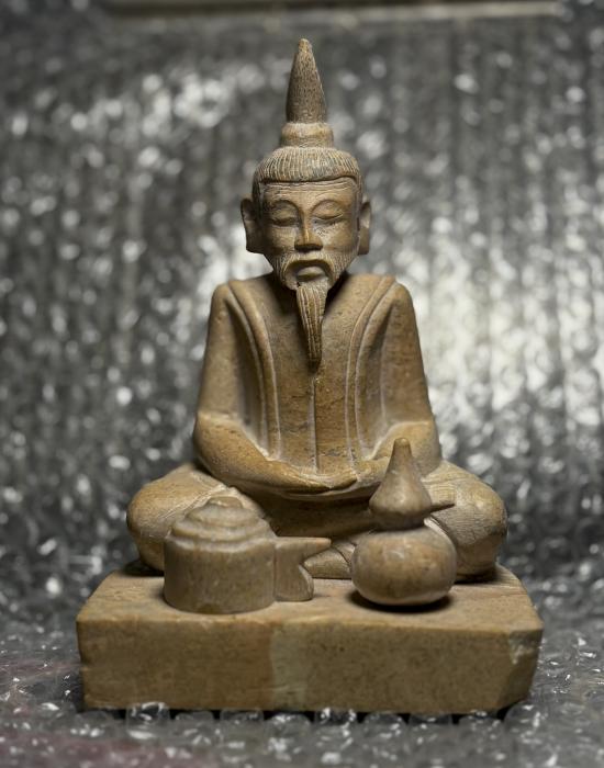 หินแกะรูปนักบวช นั่งสมาธิ แกะสวยประณีตละเอียดอ่อนทุกขั้นตอน หรือ อาจมองคล้ายฤาษี (เป็นหิน มีน้ำหนักครับ) บางมุมเหมือนมีกลิ่นไอศิลปะไปทางญี่ปุ่นครับ ฐานมีรอยการต่อเดิมเพิ่มเป็นชิ้นมา (ไม่ได้แตกแล้วนำมาต่อ เป็นการต่อตั้งแต่ตอนแกะครับ) มุมล่างขวามีรอยบิ่นครับ มีน้ำหนัก สูง ๕.๕ นิ้ว กว้าง ๓.๘ นิ้วครับ