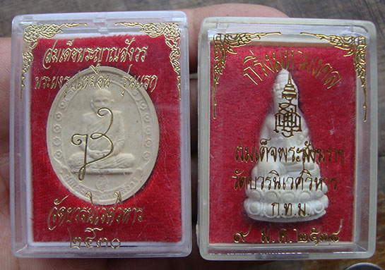 พระกริ่งมหามงคล (เนื้อผง ) ปี2538 + พระผง รุ่นแรก ปี2530 ( สมเด็จพระญาณสังวรฯ วัดบวรนิเวศฯ ) 2 องค์ กล่องเดิมสวยค่ะ
