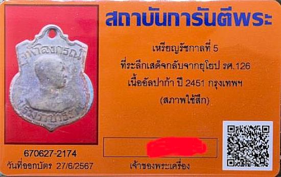 เหรียญ ในหลวงรัชกาลที่ 5 เสด็จกลับจากยุโรป ปี 2450 และบัตร gpra เลี่ยมกันนำ้ตลับพุก