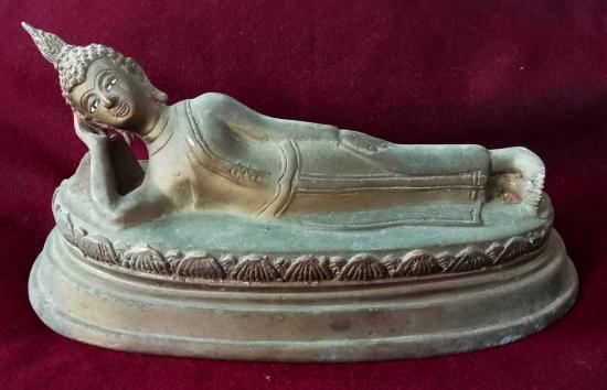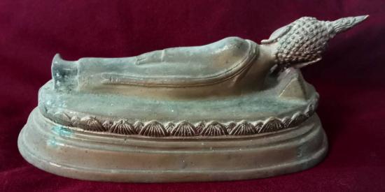 พระบูชา ปางไสยาสน์ ขนาดฐานรีประมาณ 8 นิ้ว 2 หุน X 3 นิ้ว 6 หุน ประทับนอนบนบังลังก์บัวหงาย เนื้อทองเหลืองเก่าคร่ำ เกิดสนิมหยกประปราย ผิวหิ้ง ตามุก สภาพสวยตามรูป ส่งฟรีทั่วไทย รับประกันตามกฎครับ