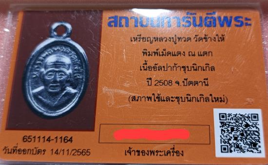 หลวงปู่ทวดเหรียญเม็ดแตง ณ.เเตกพร้อมบัตรระบุสภาพ...รับประกันแท้ตามกฎครับ