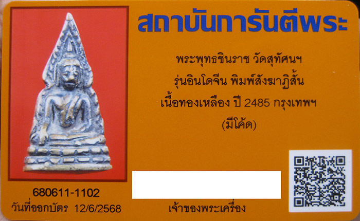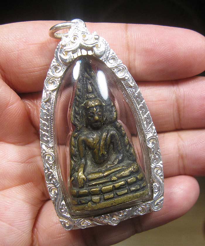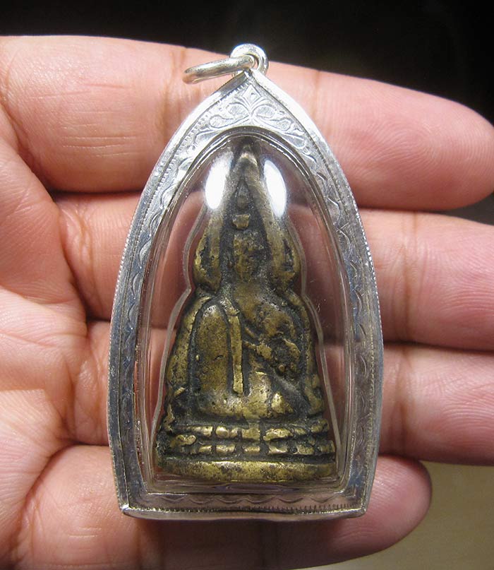 พระพุทธชินราชอินโดจีน พิมพ์สังฆาฎิสั้น เสาร์ห้าหน้าเล็กแขนยาว มีโค้ด เลี่ยมเงินยกซุ้มใบใหญ่ พร้อมบัตรรับรอง