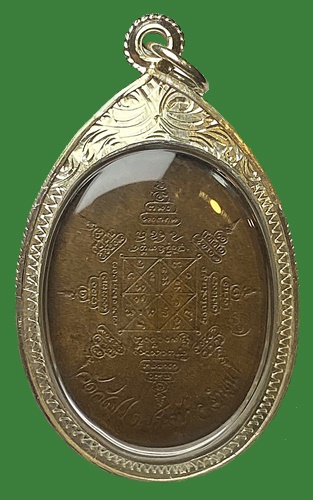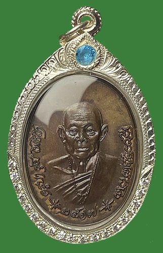 เหรียญครูบาชุ่ม วัดวังมุ่ย รุ่นแรก พิมพ์ใหญ่ เนื้อทองแดง ปี2517 เลี่ยมเงิน มีบัตรรับรองจีพระ เคาะเดียว