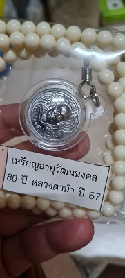 เหรียญอายุวัฒนมงคล 80 ปี เนื้อตะกั่ว(มีค่าดั่งทองคำ)หลวงตาม้า วัดถ้ำเมืองนะ พร้อมรอยจารหลวงตาม้า เลี่ยมจากวัดพร้อมประคำ