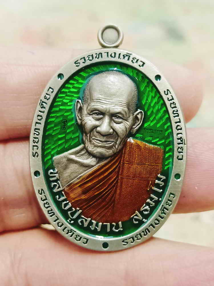 วัดใจ 100 เหรียญรวยทางเดียว หลวงปู่สมาน ที่พักสงฆ์เขายางหัก จ.ราชบุรี ปี 2566 เนื้ออัลปาก้าซษติน ลงยาเขียว ขอบ จีวร หมายเลข 71 สร้าง 99 กล่องเดิม |