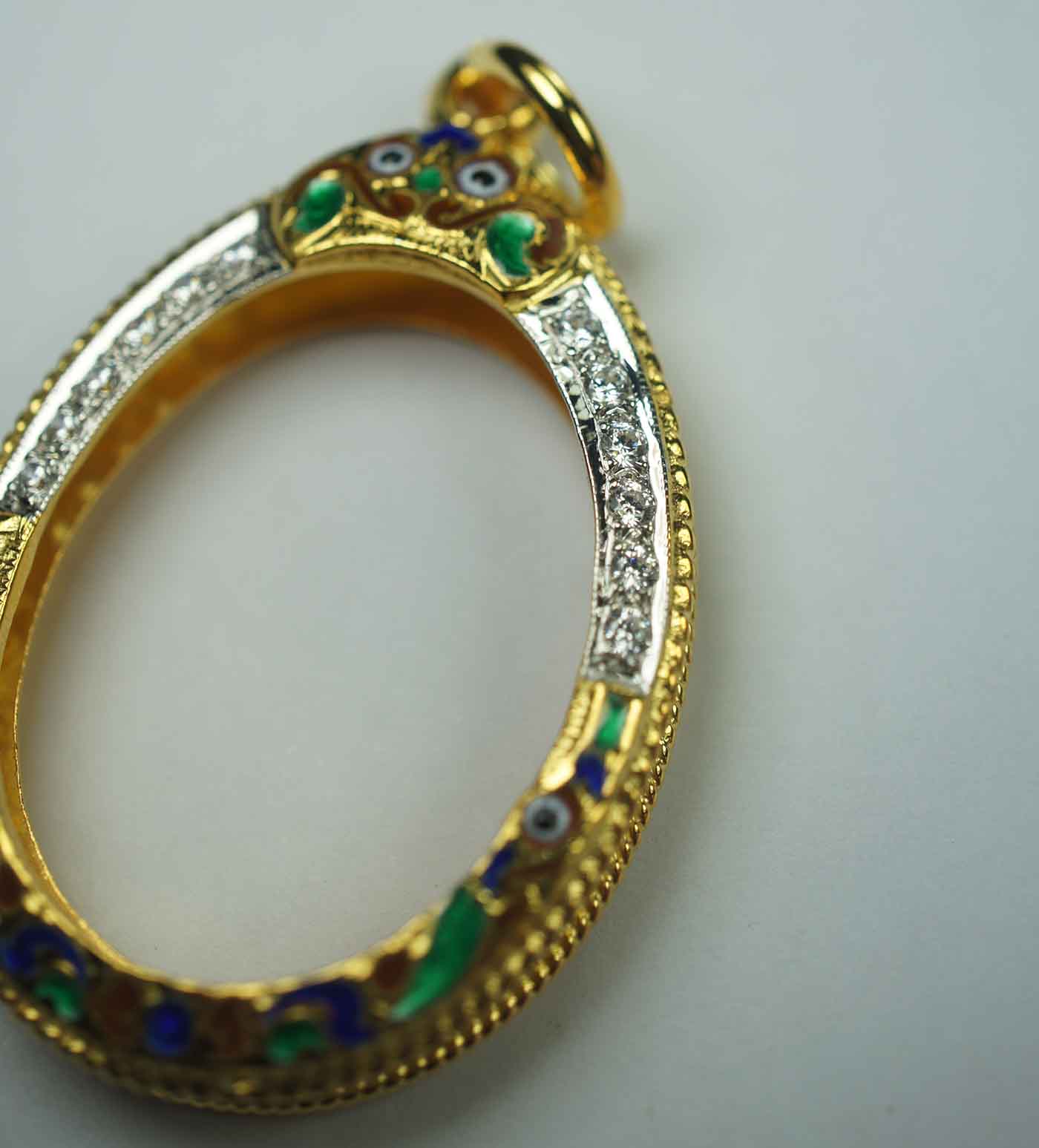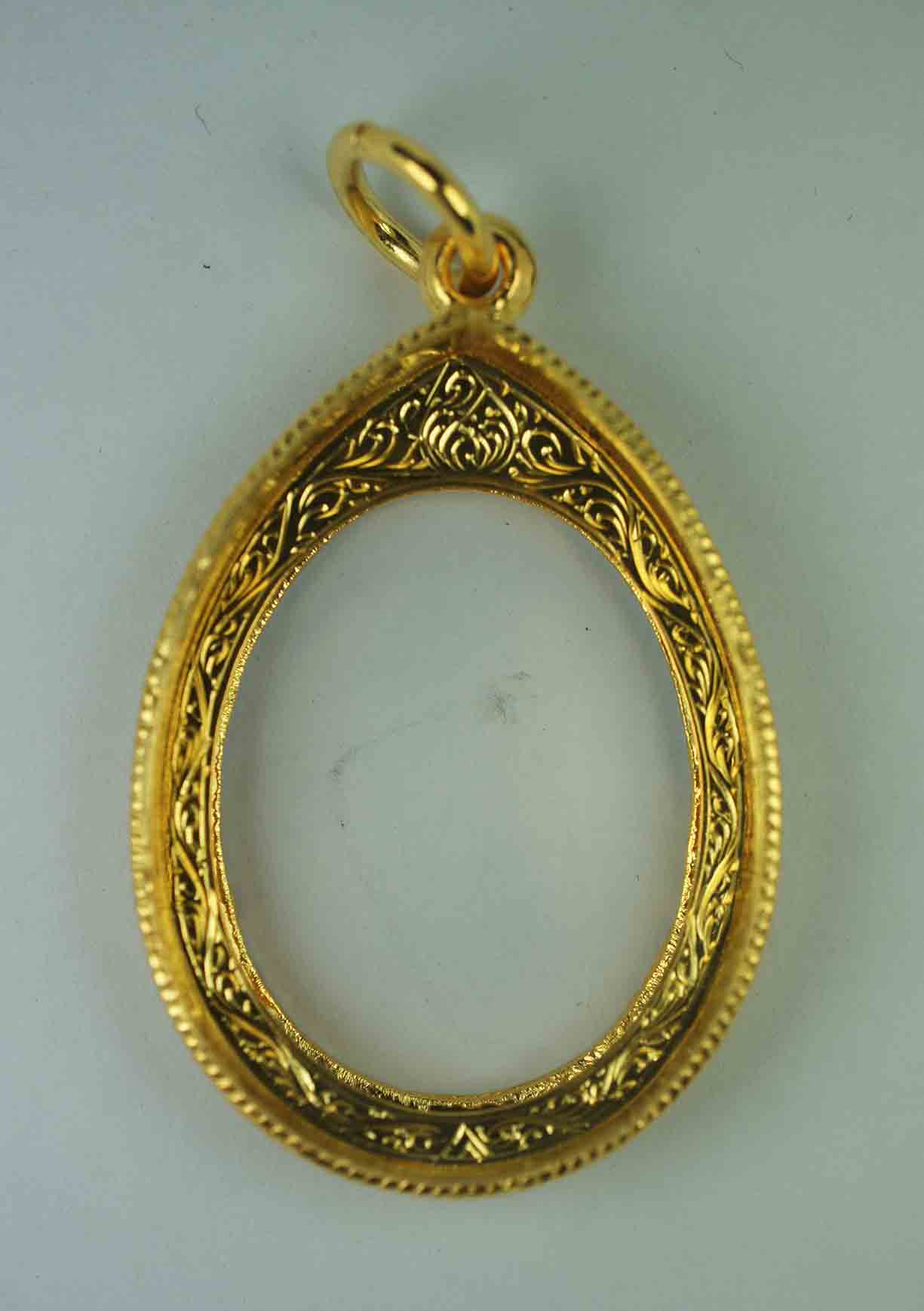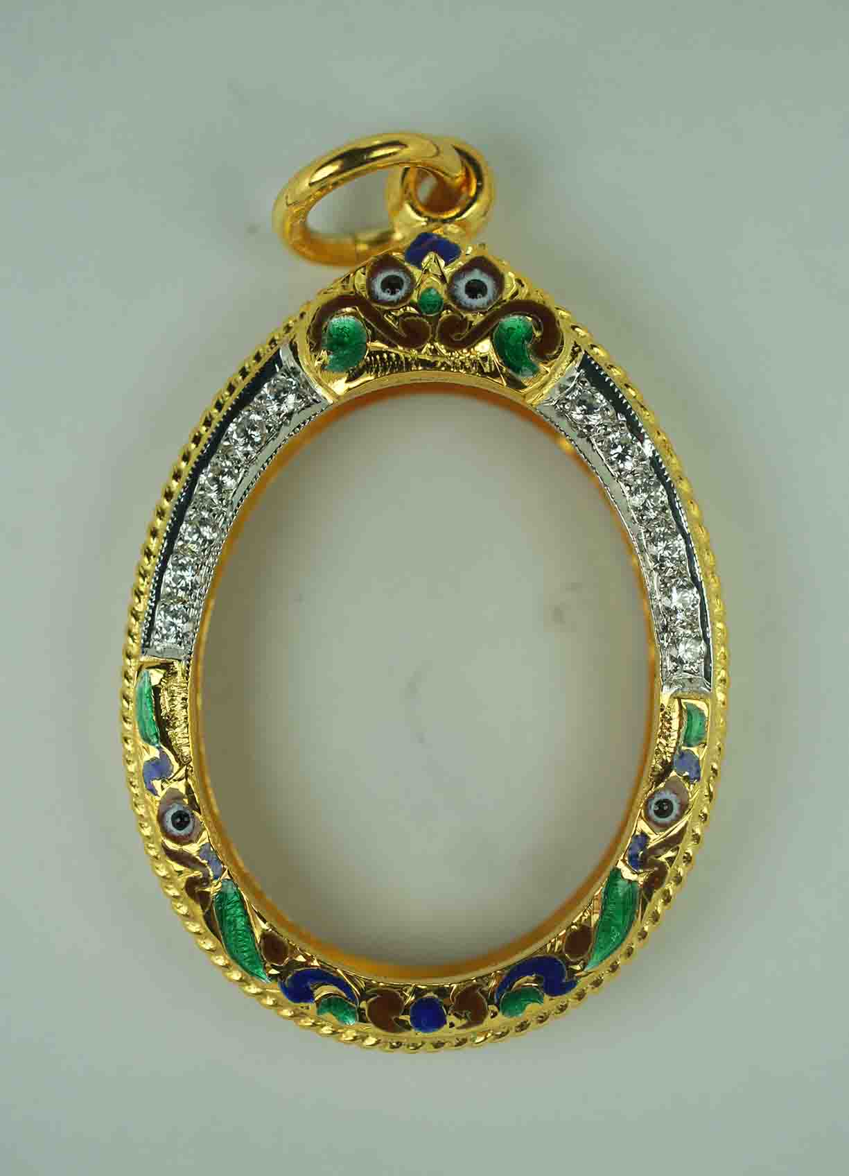 งานกรอบเงินแท้ ( มือหนึ่ง ) ชุบทองแท้ รูปไข่ ยกซุ้ม หัวสิงห์ ลงยา ฝังเพชร ชุบหน้าขาว ใส่เหรียญ ผูกพัทธสีมา หลวงปู่ทิม หรือขนาดไกล้เคียง ขนาดความสูง 2.8 ซม. กว้าง 2.2 ซม. งานขึ้นมือ ( มาตรฐานงานตัวเดีย |