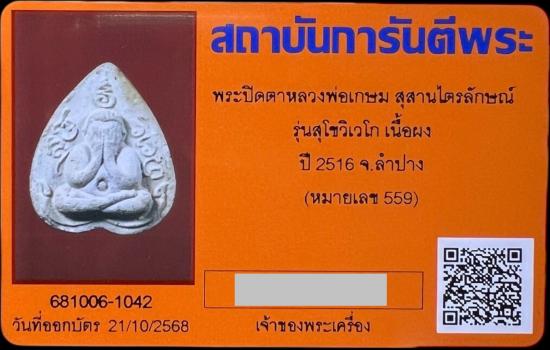 พระผงปิดตาใบโพธิ์ (สุโข วิเวโก) หลวงพ่อเกษม เขมโก พระอริยสงฆ์แห่งเมืองรถม้า นครลำปาง ซึ่งสร้างขึ้นเมื่อปี ๒๕๑๖ จำนวนสร้าง ๓,๐๐๐ องค์ หลวงพ่อเกษม ปลุกเสกเมื่อวันที่ ๑๑ กรกฎาคม ๒๕๑๖ เวลา ๒๒.๐๐ น. โดยทำพิธีที่ศาลเจ้าร้าง หน้าบ้าน เจ้าประเวทย์ ณ ลำปาง มวลสารที่จัดสร้างประกอบด้วย ดอกไม้ ธูป ริบบิ้น ของหลวงพ่อเกษม เขมโก, ผงลบสูตร สมเด็จพระพุทธโฆษาจารย์ วัดเทพศิรินทรฯ, ผงหลวงพ่อขอม วัดไผ่โรงวัว, ผงพระกรุลำพูน, ผงว่านจำปาศักดิ์ กรุวัดรังษี, ผงเหลือจากการสร้างพระสมเด็จสันติสุข วัดหลวงปรีชากุล, ผงนางพญางิ้วดำ, ผงกรุวัดมหาธาตุ จ.สุพรรณบุรี, ผงพระสมเด็จ วัดวิเวก ที่ชำรุด, ผงพระกรุวัดสามปลื้มที่ชำรุด, ผงสมเด็จ "อุ" พิเศษ ท่านเจ้าคุณนรฯ, ผงชินเก่าพระกำแพงศอก จ.สุพรรณบุรี, ผงตะไบชนวนพระชัยท่านเจ้ามา, ผงตะไบชนวนพระกริ่งวัดสุทัศนฯ, ผงผ้ายันต์ต่างๆ ของหลวงพ่อจาด หลวงพ่อพริ้ง หลวงพ่อจง หลวงพ่อเหลือ หลวงพ่อมา หลวงพ่อปาน, ผงช้างเหนียวหิน, ผงแร่เกาะล้าน หลวงพ่อบัว, ผงลูกหมากโทน หลวงปู่เอี่ยม วัดหนัง, ผงพระกรุถ้ำค้างคาว, เม็ดขนุนทองแดง, ดินจากสังเวชนียสถาน ๔ แห่งในอินเดียและเนปาล, ผงมหาราช, ผงนะ ๑๐๘, ผงอิติปิโสรัตนมาลา, ผงอิทธิเจ,ผงปถมัง, ว่าน ๕๖ ชนิด ฯลฯ วัตถุประสงค์ในการจัดสร้างเพื่อหารายได้ร่วมก่อสร้างโบสถ์วัดอินทรประชาราษฎ์ จ.ปราจีนบุรี ***นับเป็น "ของดี" ที่ยังมีราคาเช่าหาไม่สูงนัก คือ ประมาณหลักพันกลางๆ แต่คุณวิเศษสุดยอดมาก สมคำเล่าลือว่า พระทุกรุ่นทุกพิมพ์ที่หลวงพ่อเกษม เขมโก ปลุกเสก มีพุทธคุณล้ำเลิศในทุกด้าน พระสวยเดิมๆค่ะ