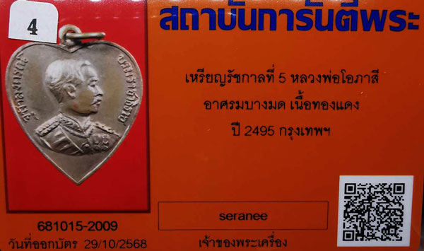 เหรียญรัชกาลที่5 หลวงพ่อโอภาสี อาศรมบางมด พิมพ์รูปหัวใจ เนื้อทองแดง ห่วงเดิม ปี2495 จ.กรุงเทพฯ + บัตรG-pra สภาพสวยเดิมค่ะ |