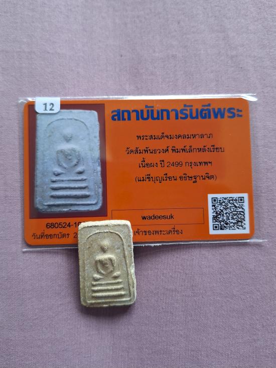 พระสมเด็จมงคลมหาลาภ วัดสัมพันธวงศ์ พิมพ์เล็กหลังเรียบ เนื้อผง ปี 2499 กรุงเทพฯ (แม่ชีบุญเรือน อธิษฐานจิต)