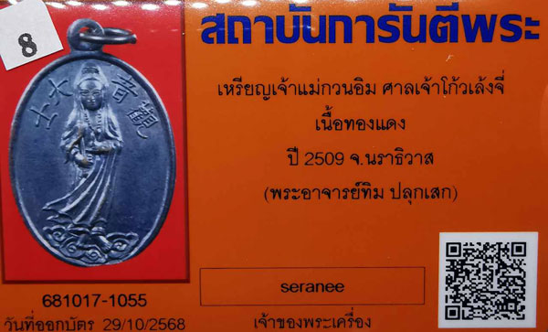 (หายาก พบเจอน้อย)เหรียญเจ้าแม่กวนอิม ศาลเจ้าโก้วเล้งจี่ เนื้อทองแดง ห่วงเดิม ปี2509 จ.นราธิวาส(พระอาจารย์ทิม ปลุกเสก) + บัตรG-pra สภาพเดิมค่ะ