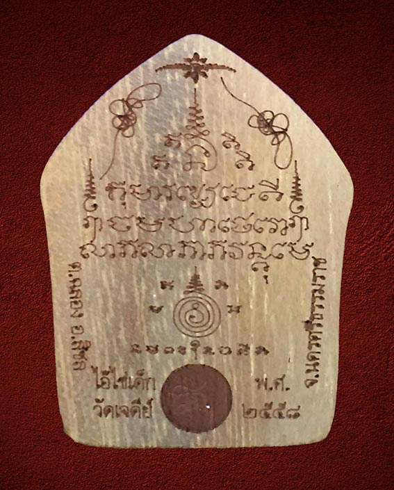 ด้านหลังพิมพ์เป็นลายยันต์มหาเศรษฐี พุทธคุณครบเครื่อง. ค้าขายร่ำรวย ลูกค้าเข้ามาอุดหนุนไม่ขาดสาย ถือได้ว่าเป็นวัตถุมงคลที่โด่งดัง และมีผู้ศรัทธา ไขว่คว้า หามาเป็นเจ้าของมากที่สุดในขณะนี้ ..
