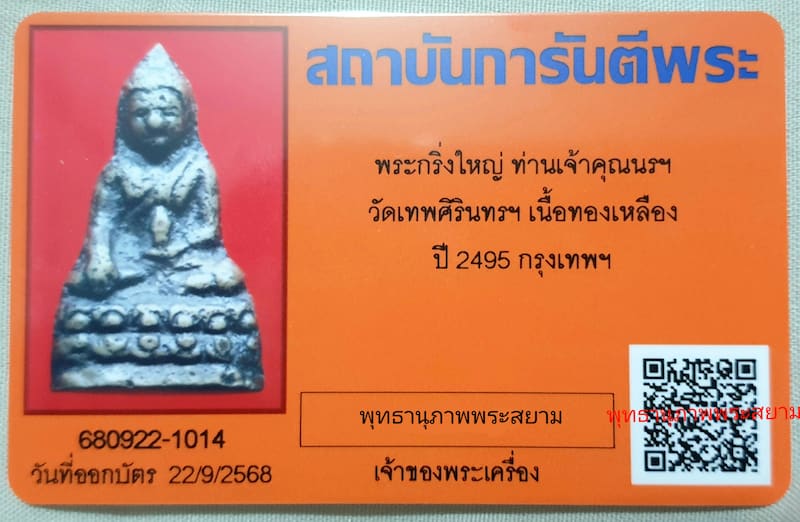 พระกริ่งใหญ่ เจ้าคุณนร วัดเทพศิรินทร์ พิมพ์หน้าไทยฐานสูง (หายากนิยมสุด) ปี 2495 บัตรรับรอง สภาพสวย |