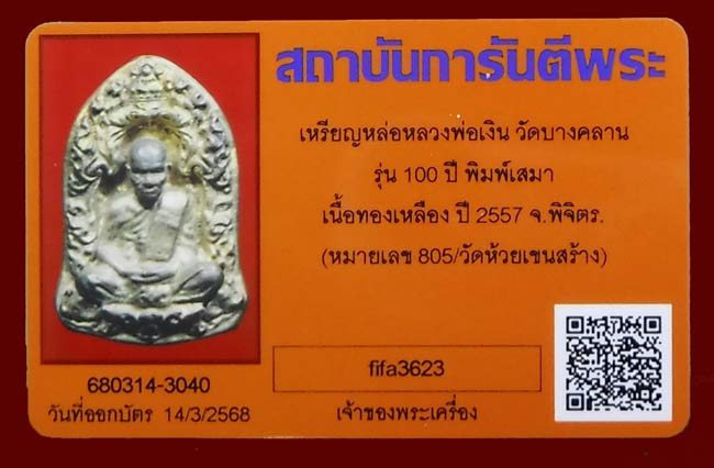 แดงที่เคาะแรก !!! เหรียญหล่อหลวงพ่อเงิน พิมพ์เสมาพุทธศิลป์ รุ่น100ปี ออกวัดห้วยเขน ปี2557 (ตอกโค๊ต+หมายเลข805) + บัตรพระแท้
