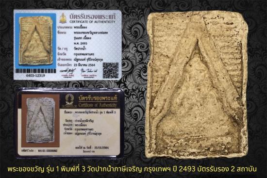 พระของขวัญวัดปากน้ำ รุ่น 1 พิมพ์ที่ 3 วัดปากน้ำภาษีเจริญ กรุงเทพฯ ปี 2493 บัตรรับรอง 2 สถาบัน