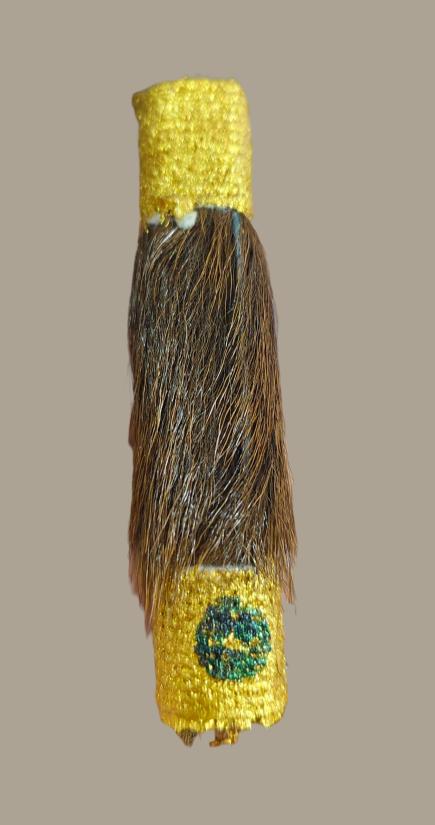 ตะกรุดโทนกระทิงเถื่อน หลวงปู่จักร วัดถ้ำเขารังไก่ ลูกศิษย์ หลวงปู่กลับมาจากต่างประเทศหอบเอา หนังกระทิงป่าสีดำเงา มีใบโพธิ์ที่หน้าผากแต้มเป็นสีขาว และท้าวทั้งสี่ ใส่ถุงเท้าขาว (หลวงปู่เรียก วัวพระยา) ให้หลวงปู่ท่านลองนั่ง หลวงปู่ก็นั่งฉลองศรัทธาปลุกเสกของอยู่ เป็นหลายคืน ท่านก็เห็นดีเห็นงามด้วยที่จะเอาหนังกระทิงนี้มาทำตะกรุด ท่านบอกว่า กระทิงนี้มัน ปราดเปรียว มันเด็ดเดี่ยวเดินตัวเดียว และดุ ดี ถ้ามาทำตะกรุด จะ เด็ดเดี่ยว มุ่งมั่น ฮึกเหิม มีพลัง ดี ซ่อนอยู่ ว่า แล้ว หลวงปู่ก็ลงวิชาตะกรุดโทน ที่ แบบเดียวกับลงรอบเขา ระเบิดด้าน หรือ ยิงข้ามเขาหลวงปู่ไม่ได้ ม้วนและปลุกเสกตะกรุดอยู่หลายวัน จากนั้นเอาหนังกระทิงที่รองนั่งปลุกเสกมาตัดเป็นแผ่น ลงยันต์ มหาอำนาจ กลืนเลือด หุ้มเขาไปอีกชั้นหนึ่งและทำการถักเชือกที่หัวท้าย ลงทองและปลุกเสกอีก หลวงปู่บอกว่า ตอนปลุกเสกแปลกดี นิมิตออกไปทางตะกรุดโทน แต่ มีแคล้วคลาด กันภัยไว ๆมากเลย มีเด็ดเดี่ยว แบบไม่ต้องง้อใคร คนส่วนใหญ่จะมาง้อเรา เอง ทางเมตตาก็มีไปทางให้ คนเอาอกเอาใจ มีพลัง แปลกๆแฝงอยู่ครบทุกอย่าง ครอบจักรวาล สวยในซองตามรูป |