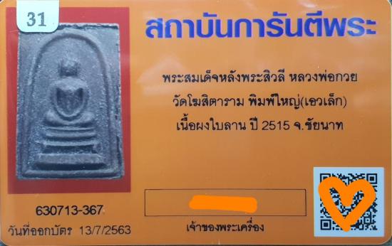 สมเด็จหลวงพ่อกวย ปี15 หลังพระสิวลี เนื้อผงใบลาน(พิมพ์ใหญ่-เอวเล็ก) วัดโฆสิตาราม จ.ชัยนาท พร้อมบัตรรับรอง