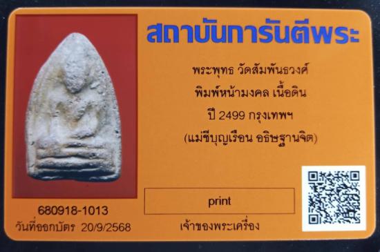 พระพุทธแม่ชีบุญเรือน วัดสัมพันธวงศ์ พิมพ์หน้ามงคล เนื้อดิน ปี 2499 (พร้อมบัตรรับรองครับ)