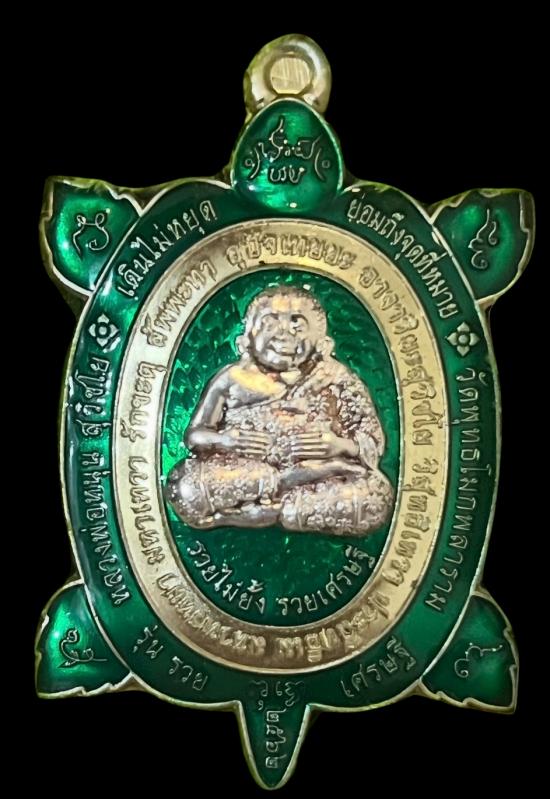 เหรียญพญาเต่าเรือน รวยเศรษฐี หมายเลข 71 อัลปาก้าหน้ากากเงิน ลงยาเขียวหน้า-หลัง หลวงพ่อหนุน วัดพุทธโมกพลาราม สายหลวงพ่อฤาษีลิงดำ |