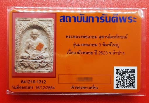 หลวงพ่อเกษม รุ่นมงคลเกษม 3 พิมพ์ใหญ่ เนื้อผงฝังพลอย ปี2533 สุสานไตรลักษณ์ จ.ลำปาง พร้อมบัตรรับรองครับ