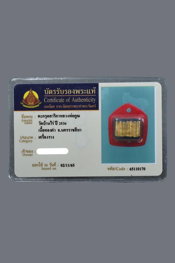 ตะกรุดสาริกาหลวงพ่อคูณ วัดบ้านไร่ จ.นครราชสีมา (เนื้อทองคำ7ดอก897) สร้างปี 2536 สวยเดิมทุกประการ (มาพร้อมบัตรรับรองนิตยสารพระท่าพระจันทร์) |