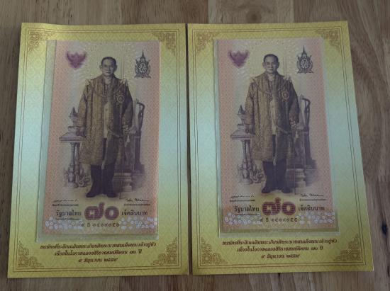 ## ธนบัตรที่ระลึก 70 บาท พระบาทสมเด็จพระเจ้าอยู่หัวรัชกาลที่ 9 ฉลองสิริราชสมบัติครบ 70 ปี ## ไม่ผ่านการใช้ 2 ฉบับ เดิมๆๆ |
