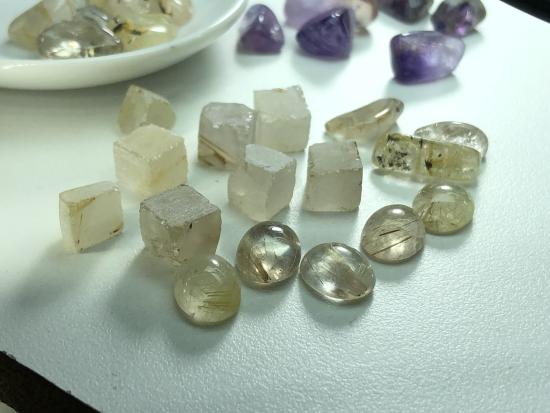 ไหมทองเจียระไนหลังเบี้ย 5 เม็ด 13.9 กะรัต เกรดงานเงิน ( แถมไหมทองแบบยังไม่เจียระไนและอเมทิสก้อนดิบอีก 100 กะรัต) |