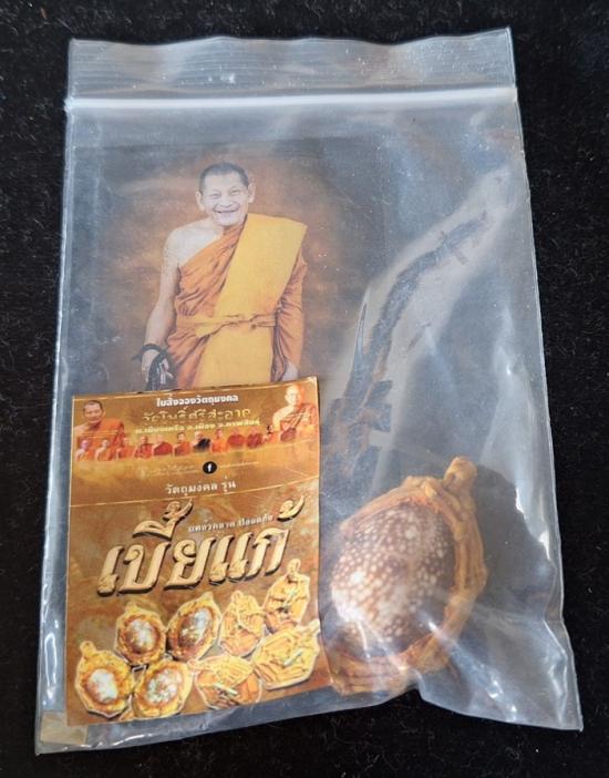 เบี้ยแก้ หุ้มจีวร ถักเชือก หลวงปู่ศิลา วัดโพธิ์ศรีสะอาด มีแผ่นเลขกำกับ ฝังตะกรุดทองเหลือง พร้อมใบคาถา ปี2567 |