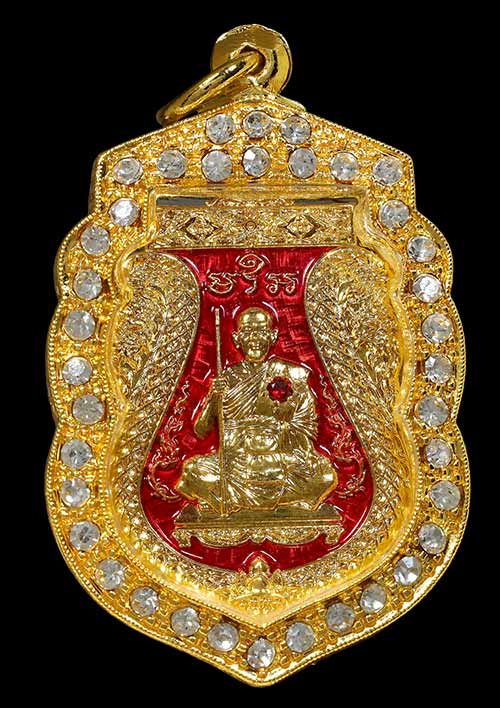 เนื้อชุบทองลงยาแดงฝังพลอยแดงสังฆาฏิ 1เม็ด เลี่ยมกรอบทองอิตาลี่ฝังพลอยพร้อมบูชา สร้างน้อยเพียง 80 องค์เท่านั้นในโลก