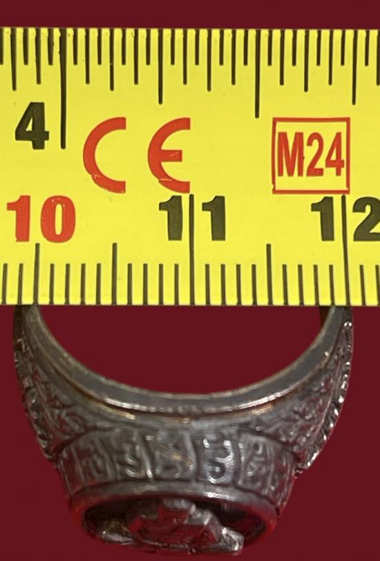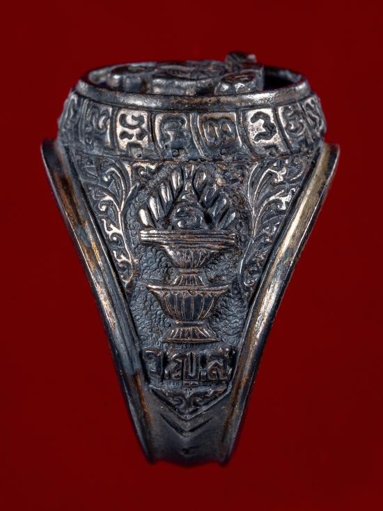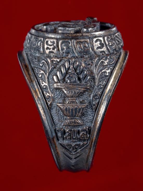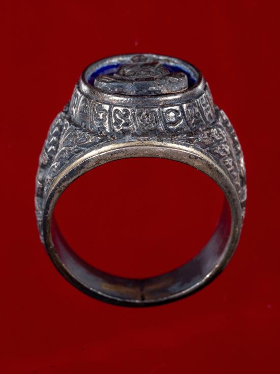 แหวนหน้าแหวนรูปเหมือน หลวงปู่ชื้น วัดญาณเสน จ.พระนครศรีอยุธยา เนื้อเงินลงยาสีน้ำเงิน ปี 2545 ตอกโค๊ด ใต้ท้องวงมีจาร |