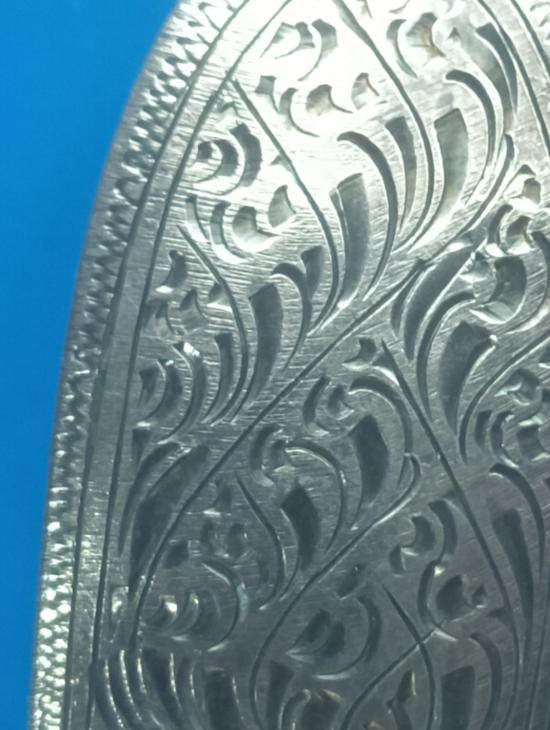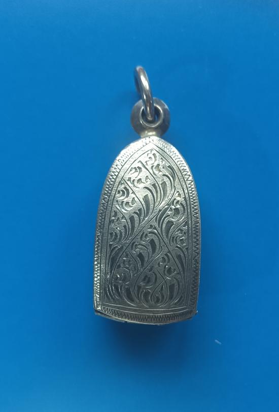 แกะลายปิดหลังสวยงาม ขนาด1.7*3.5ซม.น้ำหนักเงิน 10.52 กรัมสำหรับเลี่ยมพระรอด พระสมเด็จปรกโพธิ์ สภาพยังสมบูรณ์