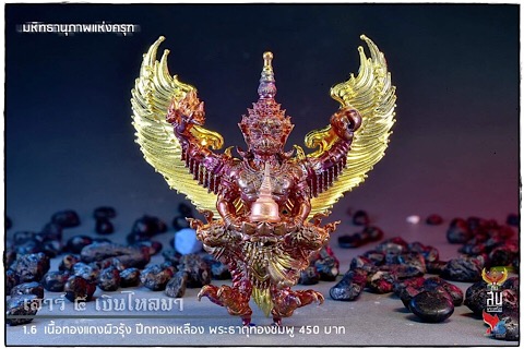 พญาครุฑเสาร์5 เงินไหลมา วัดพระมหาธาตุวรมหาวิหาร จ.นครศรีธรรมราช เนื้อทองแดงผิวรุ้ง ปีกทองเหลือง พระธาตุชมพู ขนาด 4.3 ซ.ม. |