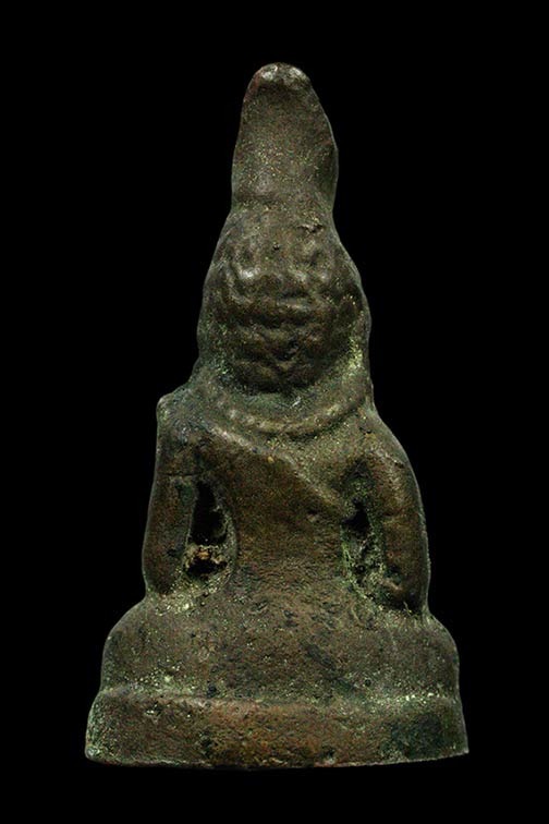 พระอุปคุต พิมพ์หมวกฤาษี ถือดอกบัว หล่อโบราณ เนื้อทองผสมแก่ทองแดงเถื่อน มีอุดกริ่งใต้ฐาน