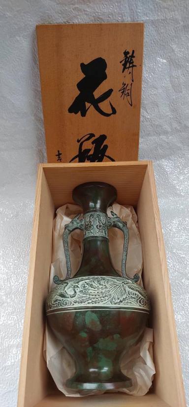 ***วัดใจ***แจกันเก่าเก็บทรงโบราณ หูมังกร เนื้อโลหะ สูง 10 นิ้ว พร้อมกล่องไม้เดิมๆ สวยๆ |
