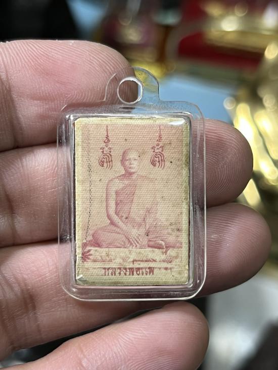 รูปถ่ายกระดาษไข่ปลา หลังผ้าจีวร ปั้มยันต์ หลวงพ่อแพ วัดพิกุลทอง ปี2517 เลี่ยมเก่า