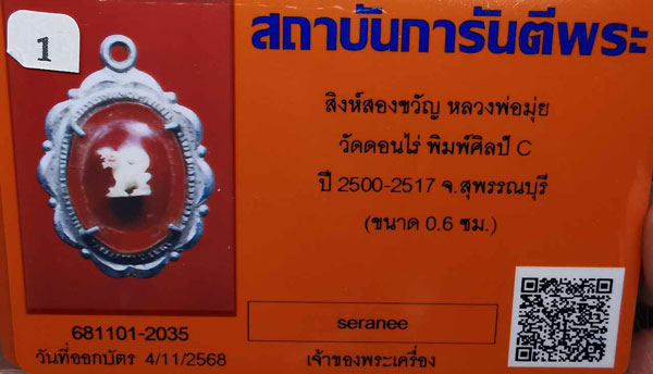 สิงห์จิ๋วสองขวัญ หลวงพ่อมุ่ย วัดดอนไร่ พิมพ์ศิลป์C ปี2500-2517 จ.สุพรรณบุรี(ขนาด0.6ซม.) + บัตรG-pra สภาพเดิมค่ะ |
