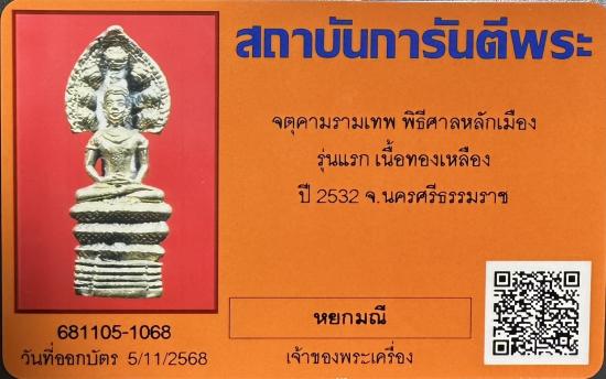 ชื่อพระเครื่อง จตุคามรามเทพ พิธีศาลหลักเมือง รุ่นแรก เนื้อทองเหลือง ปี 2532 จ.นครศรีธรรมราช (พร้อมบัตรรับรองฯ)