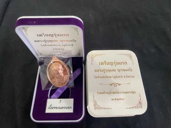 เหรียญรุ่นแรกหลวงปู่บุญเดช ญานเตโช วัดถ้ำแสงธรรม(ภูลังกา) จังหวัดบึงกาฬ เนื้อทองแดงนอก เลข 2 หลักหมายเลข 86 พร้อมกล่อง