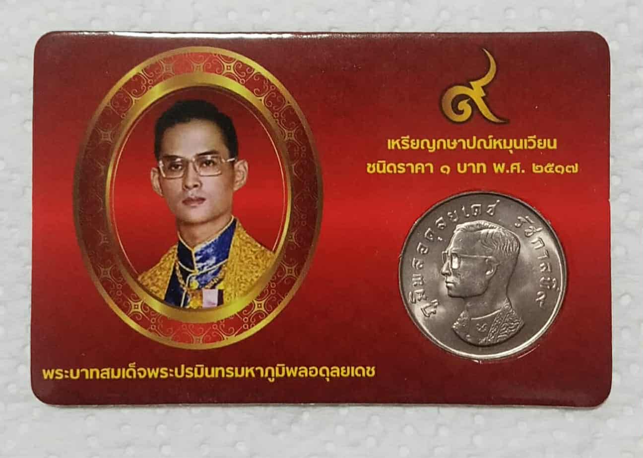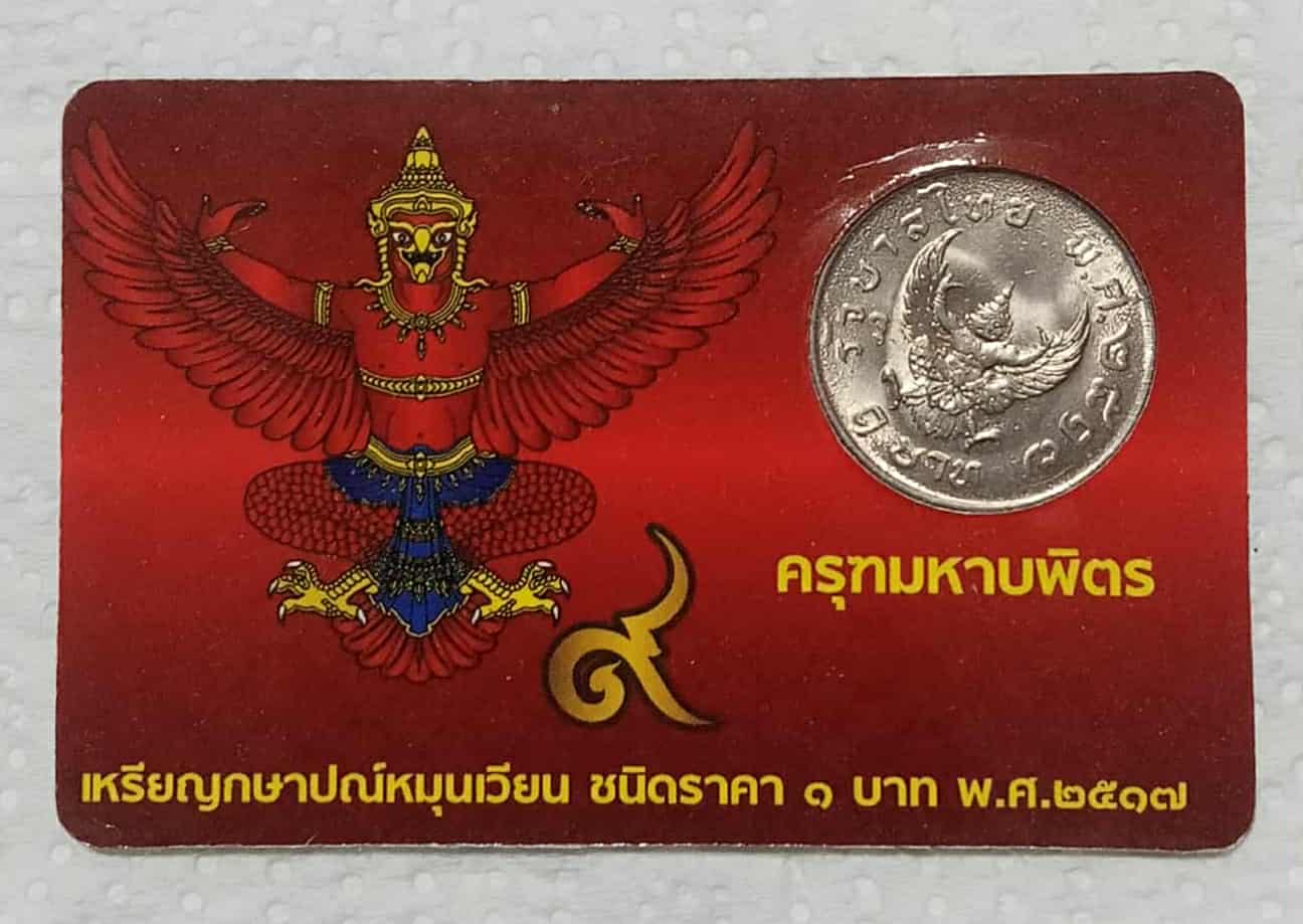 เหรียญ 1 บาท หลังครุฑ พ.ศ.2517 ในสมัยรัชกาลที่ 9 พร้อมการ์ดสีแดง พกติดตัวไว้เป็นมงคล เหรียญสภาพไม่ผ่านการใช้งาน จำนวน 1 เหรียญ ครับ ((ด้านก้อยพระเศียรเอียง อยู่ประมาณตรงเลข 7 ครับ))
