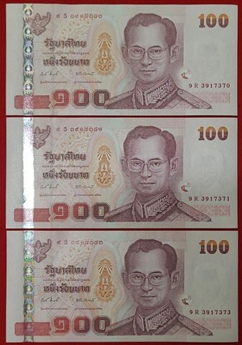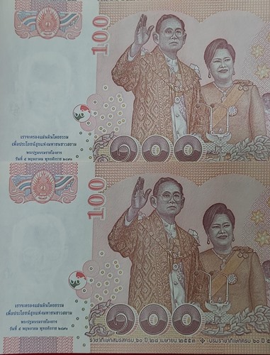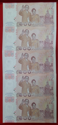 ธนบัตรที่ระลึก 100 บาท ร.9 ครบ 60ปี วันบรมราชาภิเษก และวันราชาภิเษกสมรส พ.ศ.2553 สภาพ UNC เลขเรียง 5ฉบับ #2 |