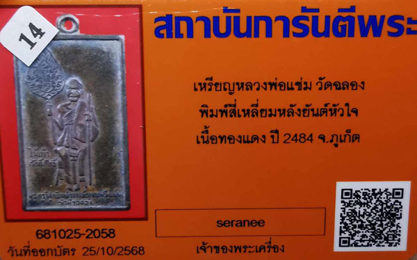 เหรียญหลวงพ่อแช่ม วัดฉลอง พิมพ์สี่เหลี่ยมหลังยันต์หัวใจ เนื้อทองแดง ปี2484 จ.ภูเก็ต + บัตรG-pra สภาพเดิมค่ะ สภาพตามรูปทุกประการค่ะ