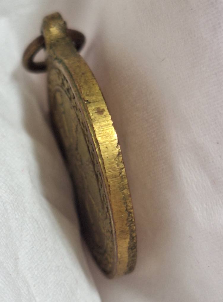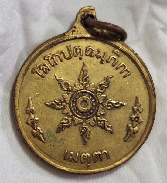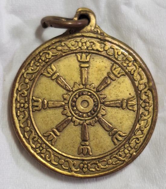 เหรียญธรรมจักร หลังมีอักษรเขียนว่า โลโกปตฺถมฺภิกา เมตฺตา เป็นเหรียญพระแท้ดูง่าย แต่ไม่ทราบที่ ตามประสบการณ์ส่วนตัวเห็นว่างานกะไหล่ทองเนื้อหาแบบนี้ น่าจะอยู่ราวช่วงปี 2500 - 251x โดยประมาณ ** สภาพยังสวย กะไหล่ยังติดเต็มดี ** |