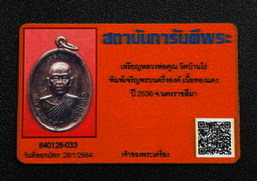 เหรียญหลวงพ่อคูณ วัดบ้านไร่ พิมพ์เจริญพรบนครึ่งองค์ เนื้อทองแดง ปี 2536 จ.นครราชสีมา สภาพสวย พร้อมบัตรรับรอง