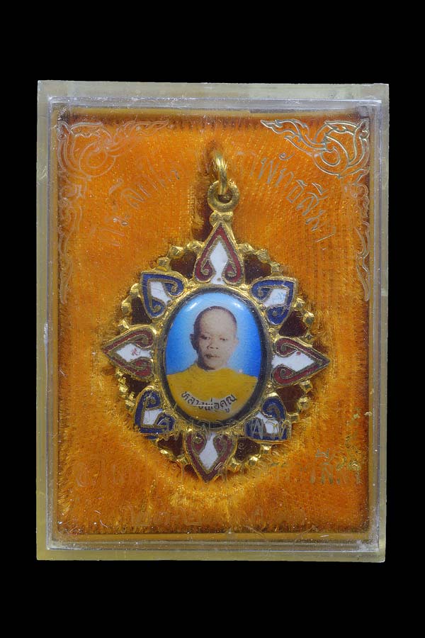 ล็อกเก็ตเข็มกลัดครึ่งองค์หน้าหนุ่ม ที่ระลึกในงานผูกพันธสีมา วัดเจริญพรต ( ตัวถังโลหะลายฉลุกะไหล่ทอง ลงยาธงชาติ ) พ.ศ.2531 ( กล่องเดิม ) ** 2 **