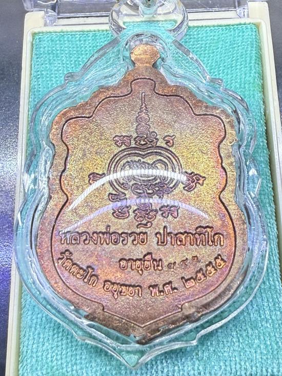 ชื่อพระเครื่อง +++เคาะเดียว เหรียญเสมา อายุยืน หลวงพ่อรวย วัดตะโก เนื้อทองแดงน้ำเงินขอบขาว (นิยม) หมายเลข 943 เลี่ยมพร้อมใช้ มีกล่องครบ+++