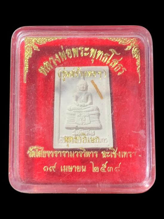 พระพุทธโสธรเนื้อผง หลังสมเด็จพระเจ้าตากสินมหาราช พิมพ์สี่เหลี่ยมฝังตะกรุดทองคำ ปี 2538 สภาพสวยเดิม พร้อมกล่อง |