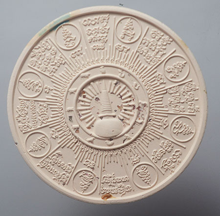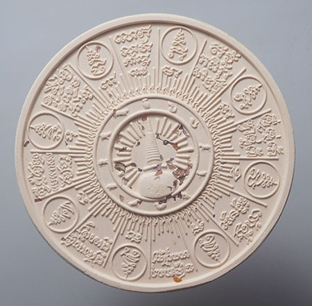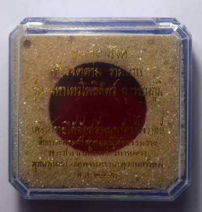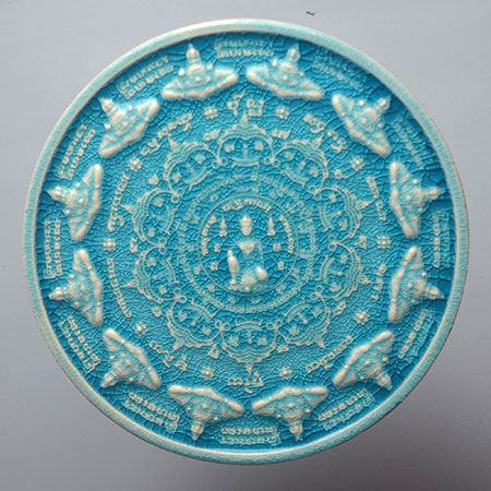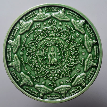 จตุคามรามเทพ รุ่น มหาเทวโพธิสัตว์สุวรรณภูมิ ปี 2550 กระเบื้องเคลือบสีเขียว และฟ้า หลังเจดีย์ โรยพลอยเสก ขนาด 5 เซน