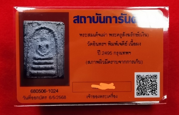 พระสมเด็จเผ่า วัดอินทรฯ พิมพ์ทรงเจดีย์ ปี2495 พร้อมบัตรรับรอง |