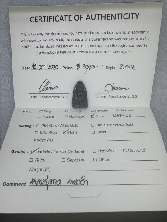 หลวงปู่ทวด เนื้อหยกดำ พร้อมใบเซอร์ ขนาดองค์พระ กว้าง 1.5 ซม.สูง 2.5 ซม.