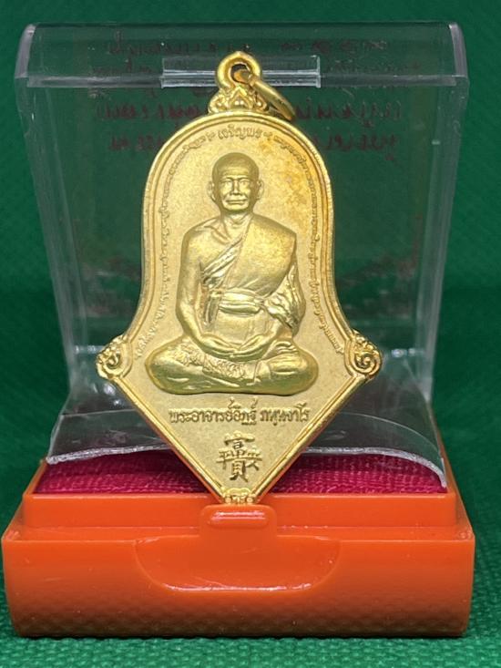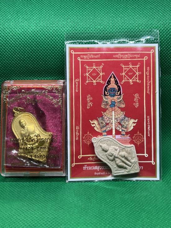 เหรียญรูปเหมือนทรงจำปี รุ่นเจริญพร เนื้อมหาชนวนกะหลั่ยทองพ่นทราย พิมพ์ใหญ่ พระอาจารย์อิฎฐ์ วัดจุฬามณี + พระผงรับขวัญศิษย์