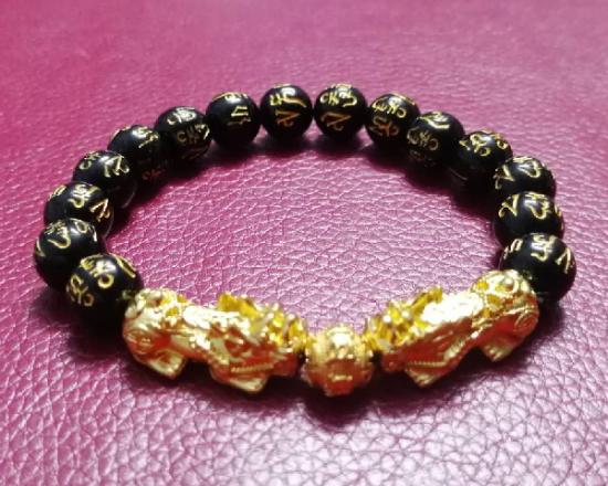 สร้อยประคำข้อมือปี่เซี๊ยะทอง+ลูกปัดลงอักขระทิเบต ขนาด 10 มิล พร้อมใบคาถาบูชาฯ (กท.92)